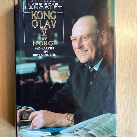 KONG OLAV V. «MONARKIET I EN BRYTNINGSTID». 1 stor og meget flott bok. Høyde 22 cm, Bredde 16 cm. En tykk bok, 392 sider, veier 855 gram. Boken er egentlig ny! Ikke lest i. Ligget lagret. Bitte litt merke øverst på omslaget. Ellers er boken SOM NY!!! N.W. Cappelens Forlag 4 opplag 1992. Boken er utgitt året etter at Kong Olav døde (han døde 17 januar 1991). Boken er skrevet av Lars Roar Langslet. Kong Olav V av Norge - Monarkiet i en brytningstid. Boken er innbundet i dyp rød/brun og er med omslag. Boken kan sendes, eller hentes her i Sandefjord. Eller avtale henting i Tønsberg på Tolvsrød! Kan også sende med «helthjem», koster kr. 82,- inntil 5 kg!! Forsikret og med sporing