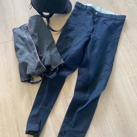 Pent brukt ridehjelm str 57/58, 2 ridebukser med skinndetaljer, hele og i orden. En i str 68/14, og en i str. 78/42. Ridepisk og diverse børster. Alt selges samlet kr 500 (Ny pris over 6000,-)