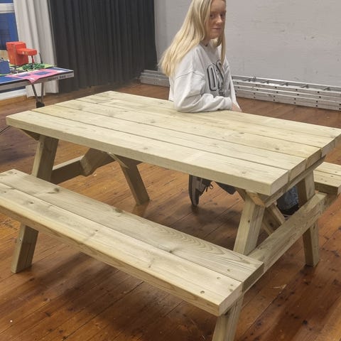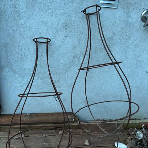 Består av galvanisert ramme (ca 1x1 m), 2 sortlakkerte halvsirkler, og «magebelte»/oppstrammer» ( dm ca 45 cm, h ca 75 cm).