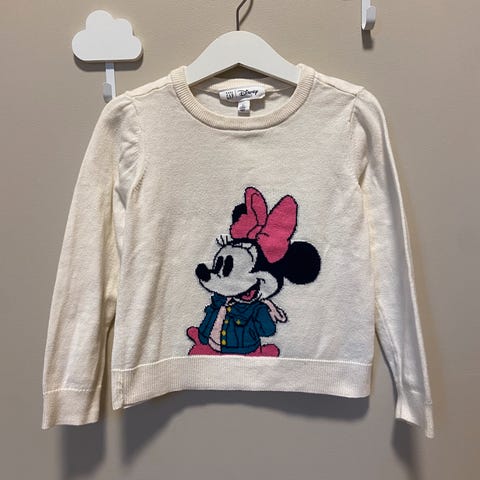 Selger jakke med Minnie Mus. Str 8 år. Pent brukt, men har noen lyserosa fargeflekker på det hvite på ermene, som er på undersiden. Se bilde.