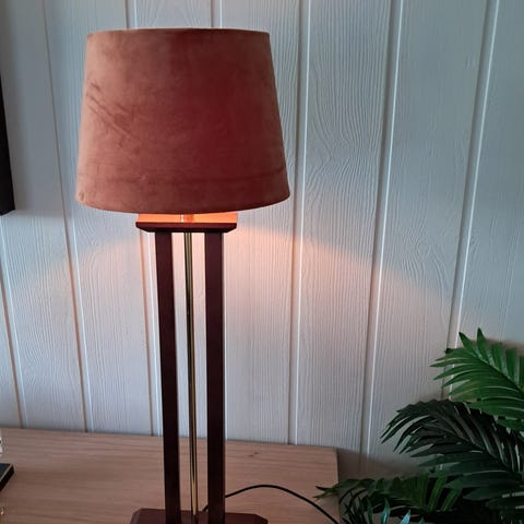 Rosa lampe med gull striper. Hvit skjerm m gullrand
