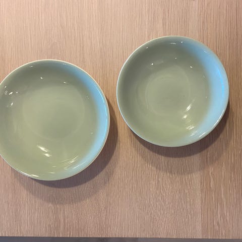 To boller eller skåler som ved første øyekast ser like ut, men kommer fra ulike produsenter. Litt ulik grønnfarge på de to. Begge er 14 cm i diameter og sju cm høye.