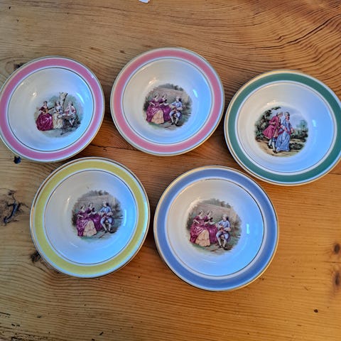 Dekor i relieff: Blomster rundt hele kanten. + blå linje.