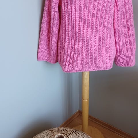 Nystrikket Logo-genser str small. 45 cm bred, og 57 cm lang. Strikket i kvalitetsgarnet Pus fra Du store Alpakka. Myk, varm og kløfri alpakkaull.