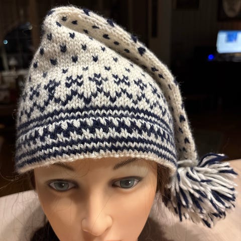 Ny hjemmestrikket lue, med juksepels kant (tosidig). Refleksgarn i selve luen.
