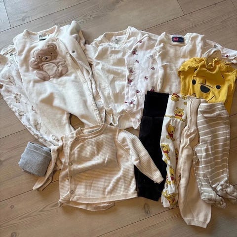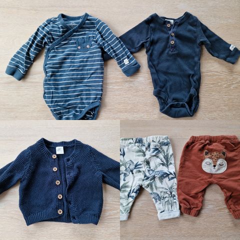 Pent brukt babyklær i str 62. Ingen hull, flekker eller skader. Den ene bodyen med biler er blitt litt nuppete og falmet, ellers veldig pent.