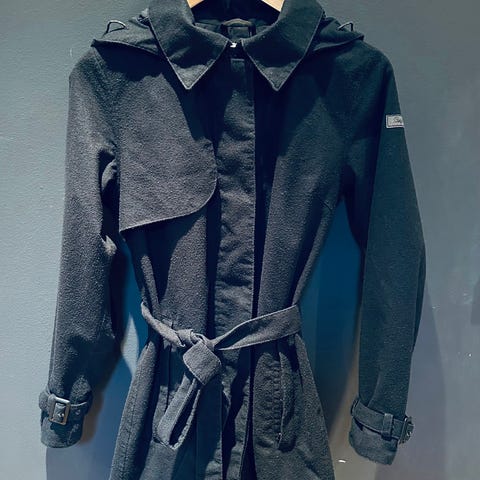 Sort trenchcoat fra Bergans. Modellen heter Oslo Lady Coat. Stretch i stoffet gjør den behagelig å ha på. Hette som rulles inn i kragen når den ikke er i bruk. Pent brukt, men fremstår med noen bruksmerker (se bilder). Hetten har noen skjønnhetsfeil på innsiden (se siste bilde), dette synes ikke når hetten er i bruk. Består av 85% nylon og 15% polyurethan. Selges ny for ca 4200.