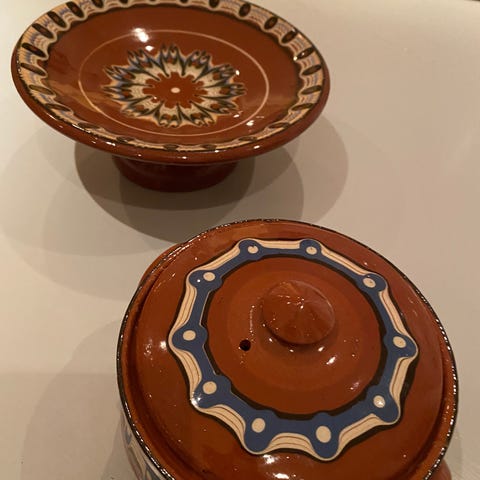 Keramisk skål/fat med fine mønstre og farger, diameter ca 16cm, høyde ca 4cm, fin stand uten store hakk/sår.