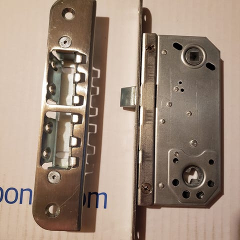 Trioving låskasse ("hyttelåsen") for lette innvendige dører hvor en ønsker en bredre avlåsning enn en-tilholder lås.