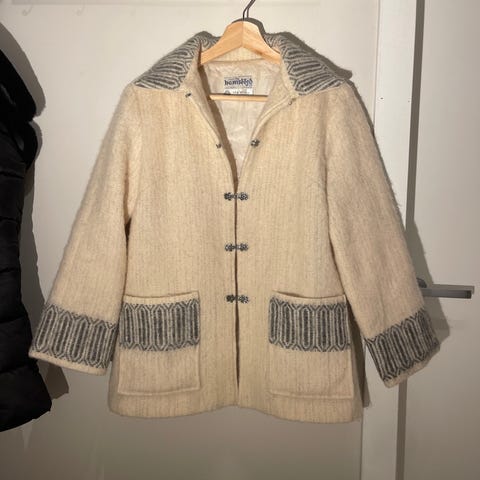 Noe slitasje og en av knappene i front mangler. Ellers er den i topp stand