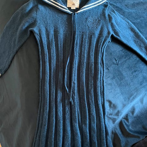 Selger nydelig lyseblå matroskjole i fra MeMini i str. 104. Kjolen er i deilig ull og passer perfekt på kjølige vårdager eller en litt kald 17.mai, men kan også brukes sommerstid.