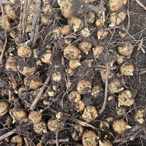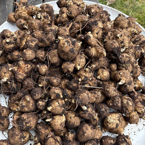 Har gravet ut nå Ferske jordskokk for 2025 selges i pakke på 10 knoller i forskjellige størrelse og settes rett ned jorda