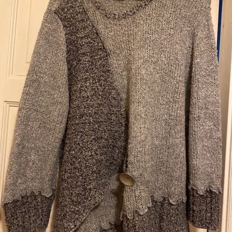 Svart/hvit spettet ull cardigan med tøffe detaljer.