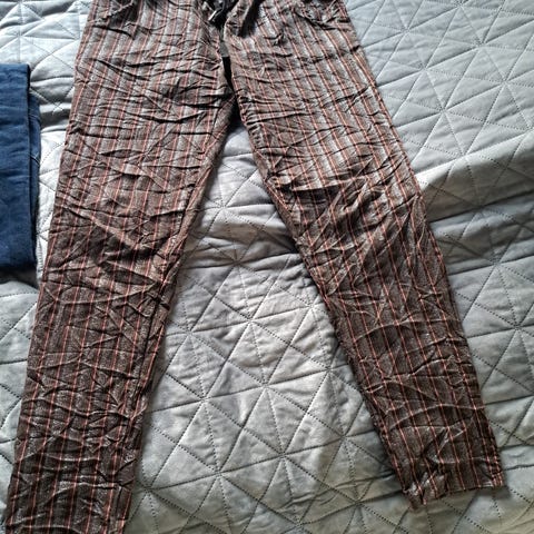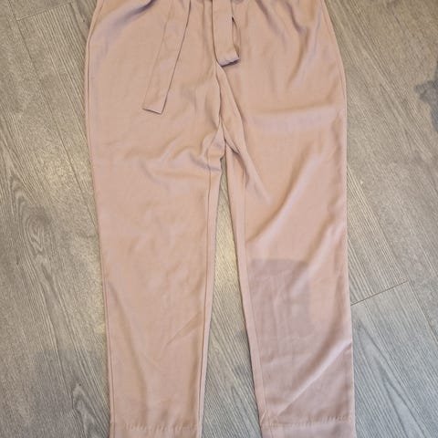 Brun stoff bukse fra B.young i str. 40. Hekter og glidelås i gylfen og stoff belte til å knytes i livet.