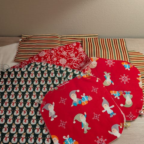 2 hjemme sydde ubrukte forklær i bomull med julemotiv. Begge til å knyte bak. Det ene er 55 cm i høyde. Det andre er 83 cm i høyde. Har nydelige detaljer på brystet, lommene og nede på forkleet. Sender gjerne med helthjem. Selges samlet for kr.200.