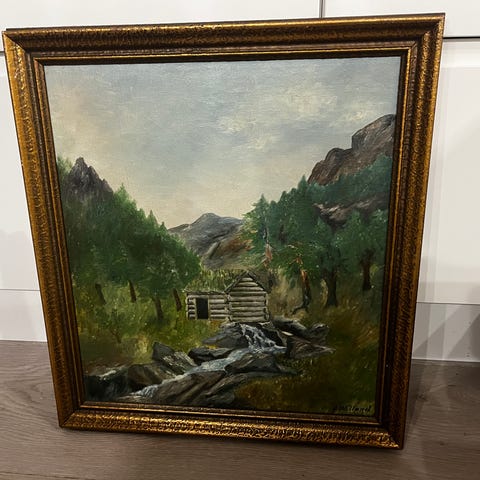 Nydelig gammelt maleri av husmannsplass ved vannet