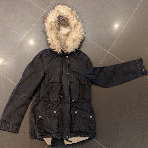Veldig fin og lite brukt jakke med ‘pels’ og avtagbar hette