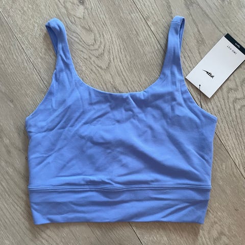 Ubrukt sports-BH med lett støtte som er designet med et minimalt antall sømmer for en mer behagelig passform. Fin blåfarge.