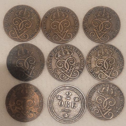 2 ØRER SVERIGE 1942-1950 JERN 9 STK ULIKE ÅR.