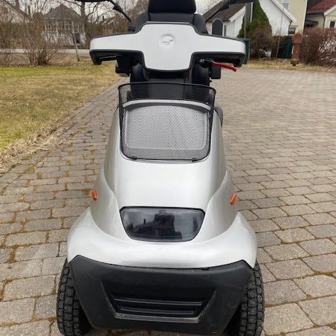 Shoprider GK9, svært lite brukt selges siden det ikke er behov for den lenger. Batteriene har fortsatt samme kapasitet og det er lite bruksmerker på den. Et ypperlig hjelpemiddel å ha med seg i bilen. Det følger med kurv og krykkeholder. Selges for 12.500.-, Ny pris i dag er 18.625 uten krykkeholder.