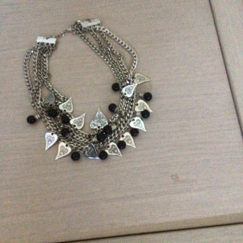 Langt smykke i den populære hjerteserien selges . Smykke er sølvfarget med noen sorte detaljer.