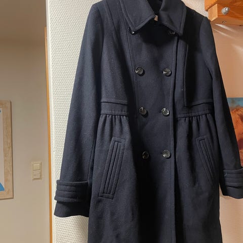 Den har type "duffelcoat" - meget god kvalitet. Belte i livet (mest for pynt). lommer og fine detaljer.