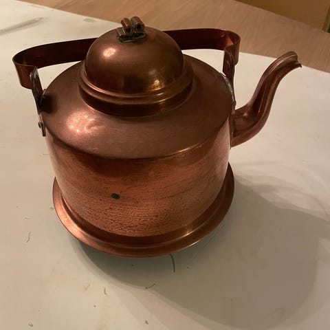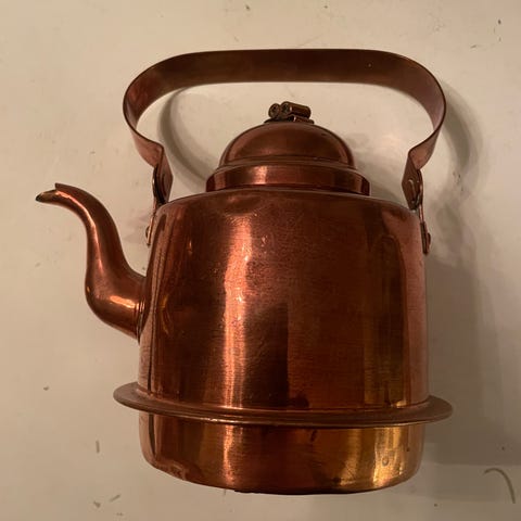 Flott gammel kobberkjele for kaffe eller te. Kjel med litt orientalsk preg, en kjel med skjel.