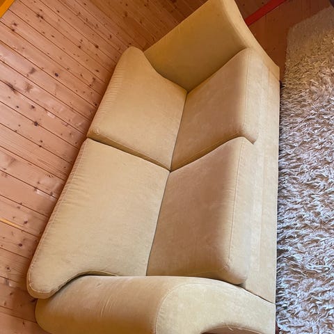 Fin, liten sofa selges billig. Stått på lager en god stund. Noen bruksmerker