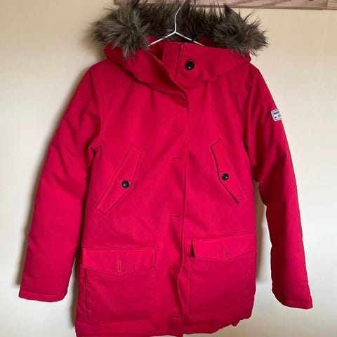 Tykk lang ytterjakke med pels på krage. Lite brukt.