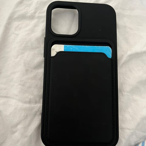 Selger fint svart mobildeksel til iPhone 12. har plass til kort.