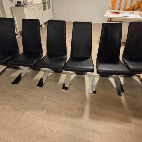 8 stk spisestuestoler i god stand selges. Lys eik med sete og rygg i stoff.