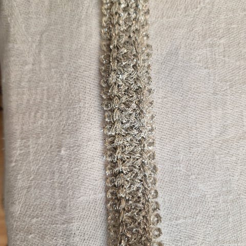 Bånd i sølvfarge, flettet og elastiske. B=2 cm. Selges pr meter.