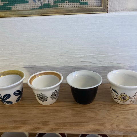 Ett eggeglass fra Porsgrund og tre fra Figgjo. Det er "Gul Grete" og "June" og ett til som jeg tror er fra Figgjo. De selges samlet for kr 120. Kjøper betaler evt porto.
