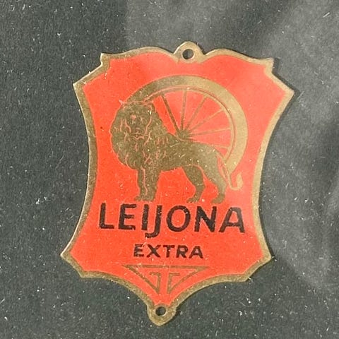 Selger et gammelt DBS sykkelmerke i aluminium, med sorte og gule farger. Litt slitasje som er normalt på et gammelt merke