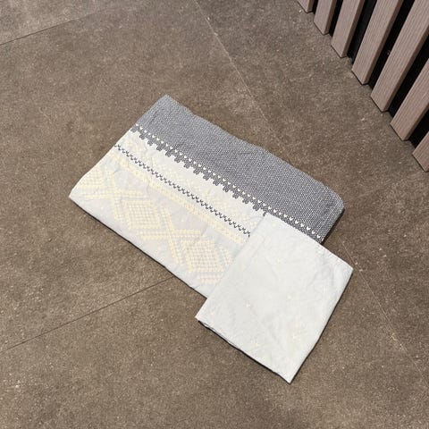 Pent brukt sengesett med Mariusmønster i lyseblått str 80x100cm. Brukt til 1 barn. Kommer fra røyk og dyrefritt hjem.