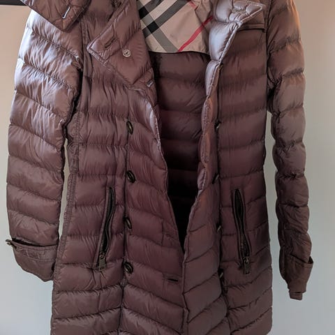 Veldig fin burgunder dunjakke fra Burberry Brit. Ekte fjær og ullstoff utvendig.
