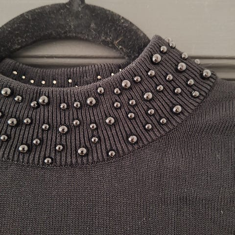 Sort genser med rund hals. Perler på forsiden i et rutete mønster.