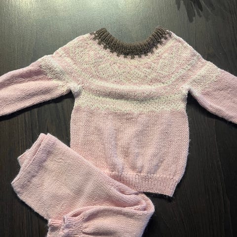 Hjemmestrikket sett, genser med matchende bukse med strikk i livet til . Ca 9 måneder. Romslig bukse. Omkrets 46 cm,