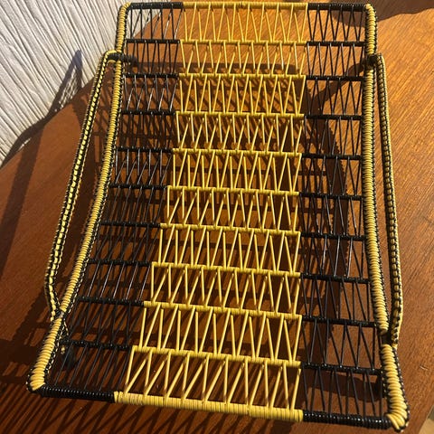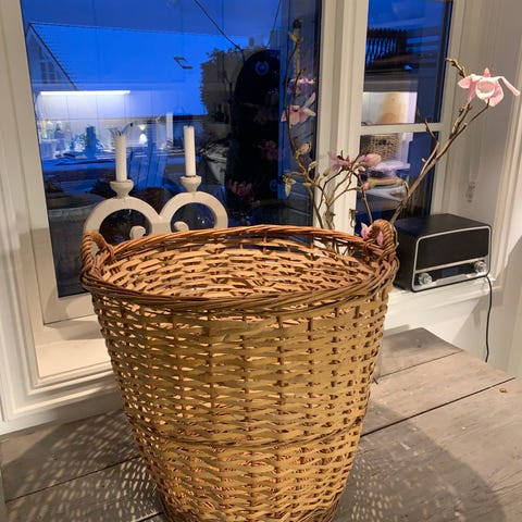 1950/60-talls flettet kurv.. 30cm lang, 15,5cm bred, ca 20cm høy. Kan også sendes.
