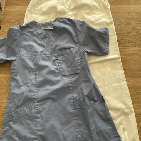 Hvit overdel i størrelse S og blå bukse i størrelse XS. Jeg bruker til vanlig S og M, men dette settet passer. Brukt 5 dager i forbindelse med klinikkuke på universitetet. Kan sendes.