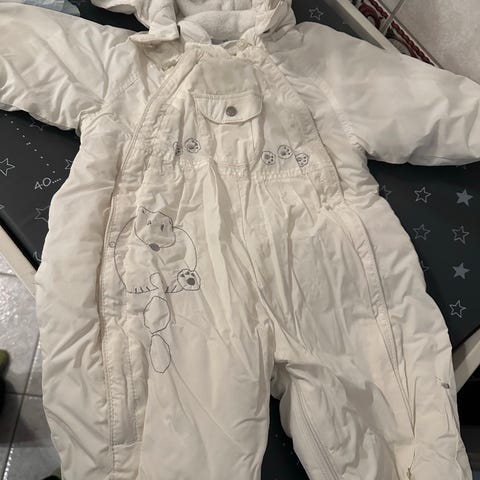 Hvit Baby Dior bobledress med detaljer i gult blomster-mønstret. Str. 3 mnd (fra skulder til fot uten sokk 50 cm). Votter og sokker tilhører. Vottene med tynt fløyelsbånd slik at de blir «hengende i dressen» og sokker som kneppes på dressen. Dressen kan kneppes opp ned på ene siden slik at den er enklere å få på. Brukt 1 gang.