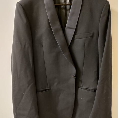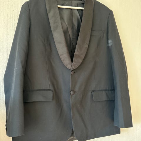 Smokingjakke Canda Classic rent ull. Svært høy kvalitet og lite brukt. Dessverre ikke med bukse. Størrelsen er ikke oppgitt på jakken, men er av den slanke typen (ca. 85 cm rundt midjen) med mål 44 cm over skuldrene, 76 cm lang i ryggen, ermene 59 cm lengde fra skulder til vrist. Én knapp foran, én på hvert erme, jakkeslagene i litt lysere materiale. Innvendig fôret, noe polstring på skuldrene.