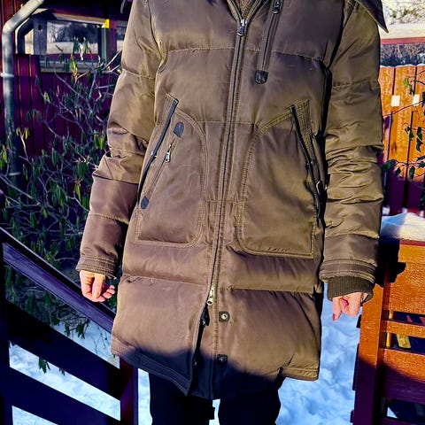 Jeg brukte denne kun 4 ganger, den er veldig varm og vakker, den er perfekt om vinteren. Den har mange lommer med glidelåser. Nettopp vasket og klær for brukt.