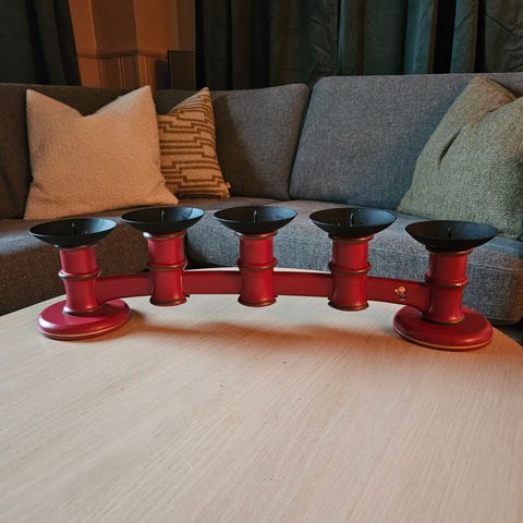 Lysestake med holdere til 5 kubbelys. Julemotiv. Lengde ca 50 cm.