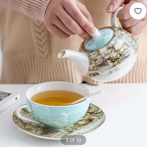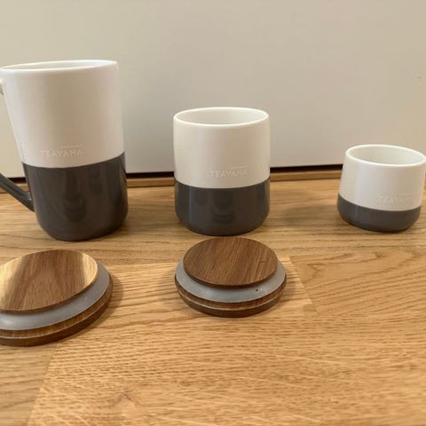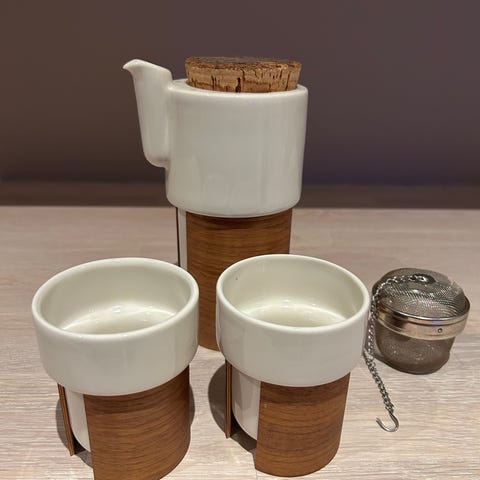 Settet inneholder 2 stk. 2,4 dl kopper, en 6 dl tekanne og en metall sil.