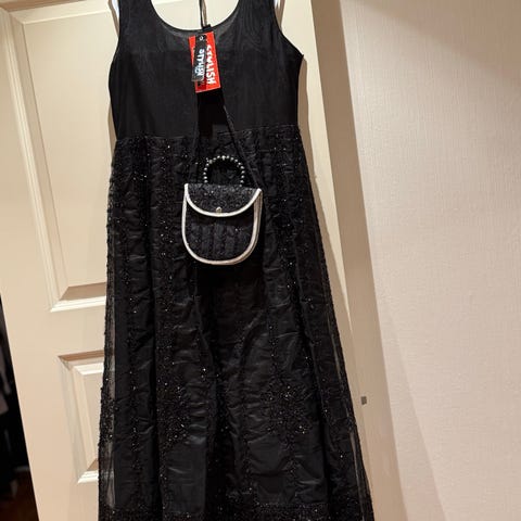Vakker kjole med paljetter på og er fullforet. Er uten ermer. Er rett og slett perfekt for alle spesielle anledninger. Glidelås bak. Kjolen har et bånd i midjen. Brukt kun en gang, ingen flekker eller slitasje. Passer til 10 år. Selges for 299,-.