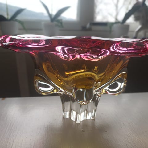 Tung Skål: Diameter14,5 cm 11 cm høy. Nydelig klart glass i rosa og bronze.