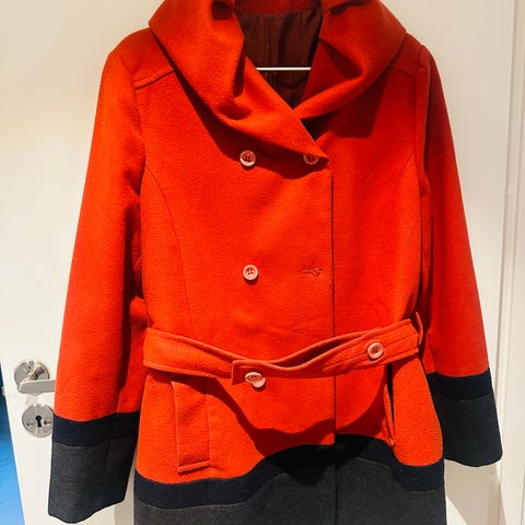 Sort kåpe med spesielle knapper i hvit og rød. Størrelse L og lett innsvinget.