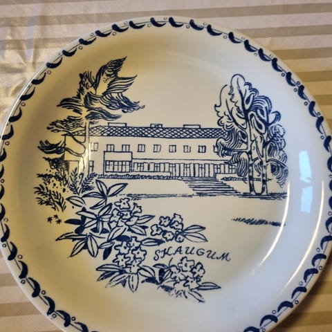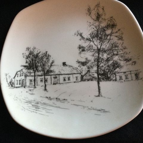 2) HOVEDBYGNINGEN (TILLA OG OTTO VALSTAD SITT TIGLIGERE HJEM) VED ASKER MUSEUM. SAMLINGEN AV HUS BLE FORÆRT ASKER KOMMUNE AV TILLA OG OTTO VALSTAD I 1949. PLATTE ER TEGNET AV ASKERKUNSTNERINNEN HANNE BORCHGREVINK, UTGITT I 1980.