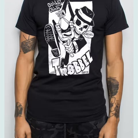 Løs tråd foran i halsen.